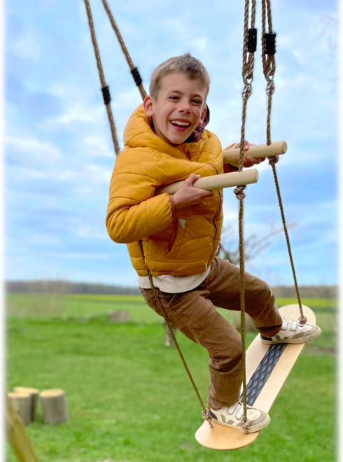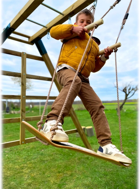 Robuste træhåndtag på rebene kan nemt skubbes til den ideelle højde. De giver støtte ved påstigning og ved gynge- og stålege.