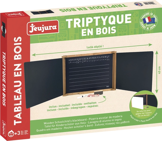 Den multifunktionelle tredelte tavle JEUJURA er et fremragende valg til børneværelset, legerummet og børnehaven. Den tilbyder en sort skriveflade til kridt og en hvid tavle til tørre tuscher, som let kan tørres af med en filt-svamp. Den centrale del af den sorte tavle er linjeret og indeholder skabeloner til håndskrift, så børn kan øve den korrekte form på bogstaver.