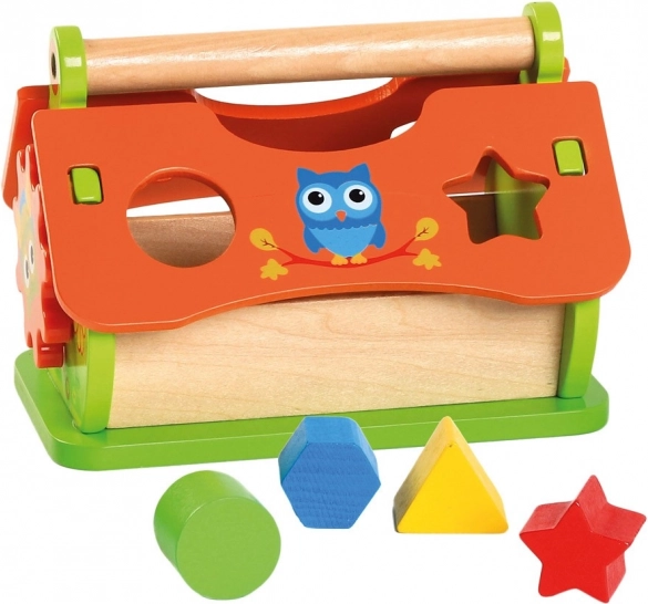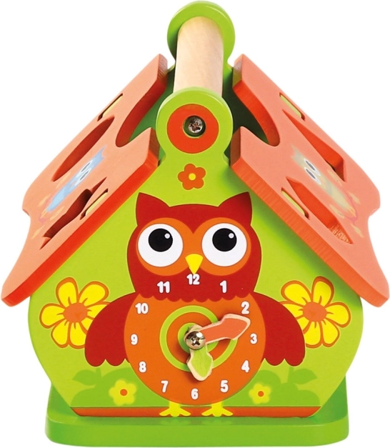 Træhus puttekasse Bino er et farverigt, lærerigt legetøj til børn fra 3 år. Børn træner fingrene ved at lægge former i, dreje tandhjulet og indstille viserne på uret med uglemotiv. Takket være kvalitets-krydsfiner og massivt træ er legetøjet stabilt, slidstærkt og klar til daglige opdagelser.