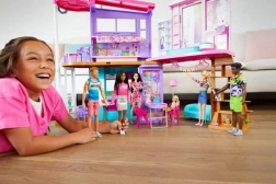 Feriehuset har to niveauer og seks legeområder som soveværelse, badeværelse og stue. Tilbyder moderne Barbie-design.