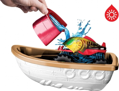 Oplev action med HOT WHEELS MONSTER TRUCKS Color Shifters – krokodillekæber legesæt! Color Shifters-bilen skifter farve ved kontakt med koldt/varmt vand, rampen indbyder til modige spring, og den aftagelige båd opsamler vand for ren leg uden rod. Inkluderer bilen Piran-ahhh.