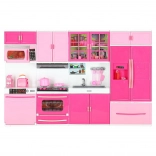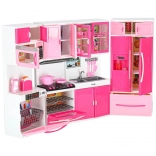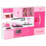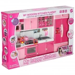 Sættet omfatter mikrobølgeovn og opvaskemaskine, komfur med ovn, vitrineskab med vask samt køleskab med skuffe. Børn kan lege hele scenariet med madlavning, bagning og oprydning.