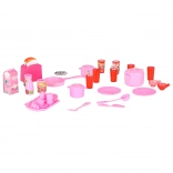 Pakken indeholder rigt tilbehør: gryder med låg, pande, brødrister med bevægelig løftestang, service, krus, bægre, “mælkekarton”, køkkenredskaber på kroge samt “isterninger”. Åbningsbare skabe, udtræksskuffe og hylder lærer børn orden, udvikler finmotorik og sociale færdigheder.