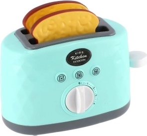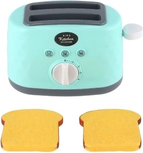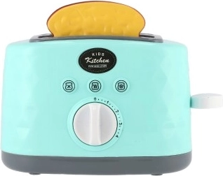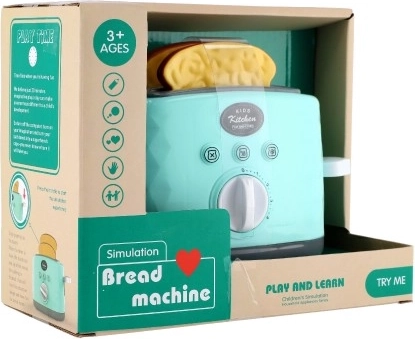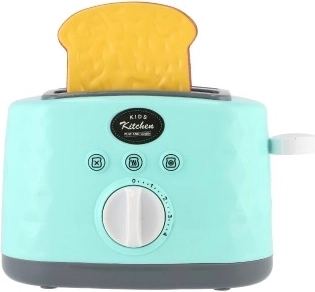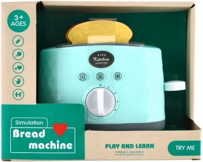 Brødrister i turkis med realistiske knapper og mekanik, der vækker børns nysgerrighed.