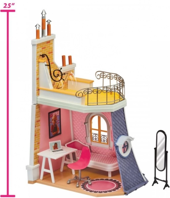 Dukkehuset har en terrasse på anden sal, dekoreret med lyserøde vægge og gelænder, som giver legen en ekstra dimension.