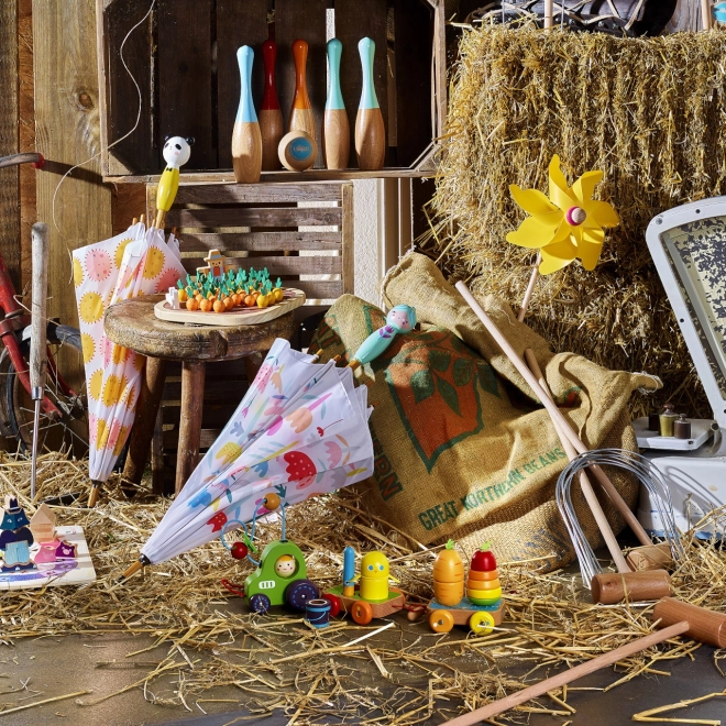 - Sammenklappelig legetøj: Pæren gemmer på en orm, kaninen gemmer sig i guleroden.