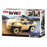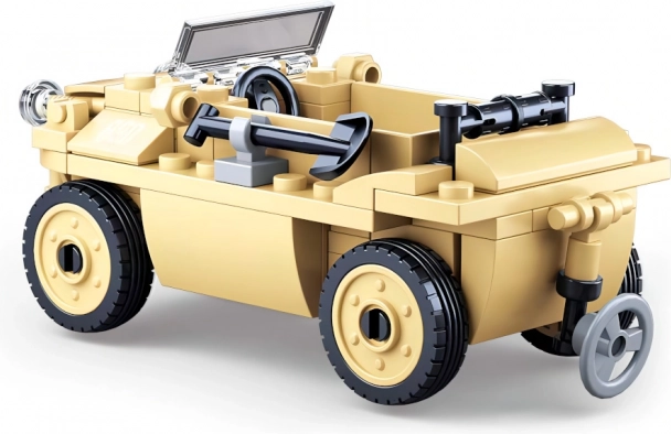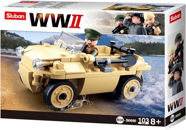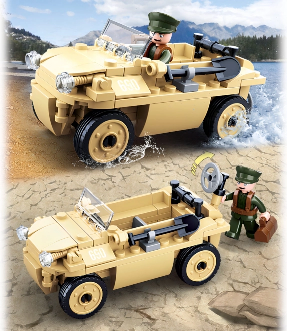 Byggesættet tilbyder en detaljeret replika af det tyske amfibiekøretøj, beriget med realistiske elementer som forrude og bevægelige hjul.