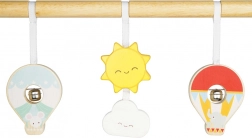 Dette stabile og sikre aktivitetsstativ til baby er lavet af træ i høj kvalitet med fokus på barnets sikkerhed. Farverige figurer i form af sky, bjerge og varmluftsballoner er ophængt i tekstilsnore og giver en blid klangen.