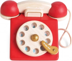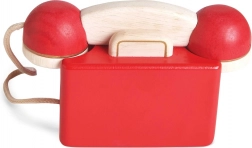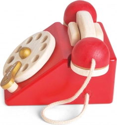 Stilfuld trætelefon i vintage-stil til små spilopper. Fremstillet af kvalitets-gummitræ, har dreiende drejeskive, klokke i røret og giftfri vandbaserede farver. Understøtter finmotorik, fantasi og lære tal – ideel til daglig leg.