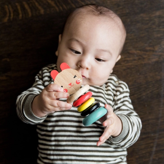 Sød træ-rangle formet som en kanin fra Petit Collage, der glæder babyer med en blid, beroligende lyd. Den har fem glatte bøgetræsringe ideelle til små hænder, klare farver og mønstre til sanseudvikling og er lavet af 100 % FSC-certificeret træ med giftfri, vandbaserede farver.