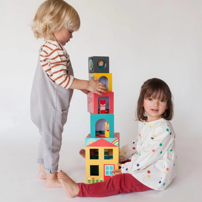 Denne smarte stabelleg udvikler barnets fantasi, finmotorik og rumlige forståelse. Børn kan bygge etager, åbne døre og vinduer og lege med de søde trævenner. Når det er tid til en pause, skubbes alt let ind i hinanden og lægges i hovedhuset med praktisk magnetlukning.