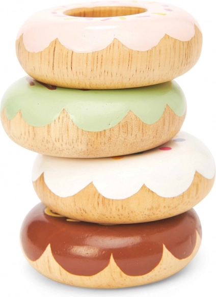 Dette sæt træ-donuts fra Le Toy Van er ikke kun æstetisk tiltalende, men frem for alt sikkert og lavet af massivt træ. Hver donut er blidt afrundet for sikker leg og dekoreret i pastelfarver med forskellige drys-mønstre. De vandbaserede farver, der bruges ved den manuelle eftermaling, er ikke‑giftige og helt sikre for børn.