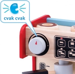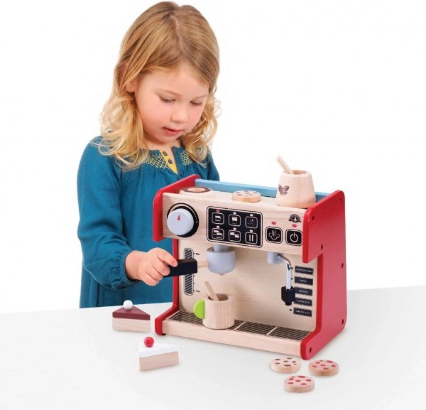 Børn kan med denne kaffemaskine opleve, hvordan det er at være barista. Sættet inkluderer en kaffemaskine med aftagelig håndtag og bevægelig mælkedispenser. Det suppleres med et betjeningspanel med drejelig knop og malede knapper.