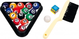 Pakken indeholder alt, hvad der er nødvendigt for at starte spillet: to køer, kugler, trekant og kridt. Dette mini bord er designet til at give en realistisk oplevelse på en lille overflade.