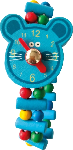 Farverigt armbånd af træperler, med filt urskive, til alle stilfulde og nysgerrige børn. Med dets hjælp lærer de nemt at finde rundt i tiden. Vigtigste egenskaber: justerbare visere