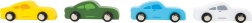- Komplet sæt – pakken indeholder fire træ-sportsbiler.