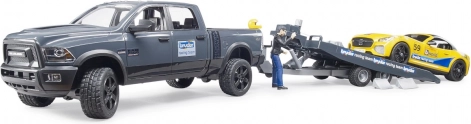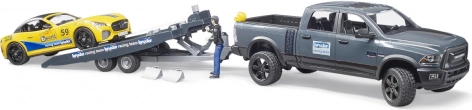 Dette realistiske sæt fra BRUDER kombinerer en robust RAM terræn-pickup med transporttrailer og en gul sportsvogn med aftageligt tag. Der medfølger også en chaufførfigur, så I straks kan tage til løb eller transportere bilen til banen. Præcis udførelse, funktionelle elementer og slidstærk plast sikrer lang levetid og en fremragende legeoplevelse.