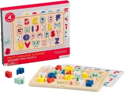 Et sjovt og farverigt sæt til de første bogstaver: alfabet-puslespil i træ med 26 afrundede brikker lærer børn at genkende alfabetet og nye ord på 4 sprog. Når bogstaverne løftes, dukker der smukke illustrationer op, fremstillet af FSC-træ og trykt med vandbaserede farver. Ideelt fra 3 år.