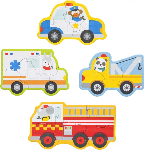 Introducér børn til redningsverdenen med søde illustrationer – en kanin kører ambulancen, en abe politibilen, en elefant brandbilen og en panda bugseringsvognen. De varierende sværhedsgrader (3, 4, 5 og 6 brikker) støtter gradvis udvikling af færdigheder, tålmodighed og glæden ved succes.