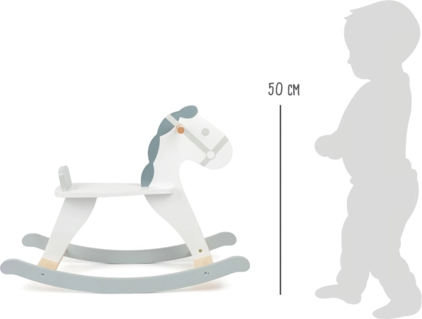 Klassisk gyngenhest i moderne skandinavisk stil, der kombinerer hvid og grå, med komfortabelt sæde med ryglæn og solid trækonstruktion. Ideel til børn fra 2 år, understøtter balanceudvikling, koordinering og giver langvarig sjov på ethvert børneværelse.