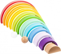 De 14 farvede buer kan samles til regnbuer, broer, tunneler og tårne. Børn øver balance og fantasi ved hver ny kombination.