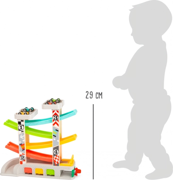 Racerbanen indeholder forskellige niveauer og farverige biler, som sikrer sjov og lærende leg.