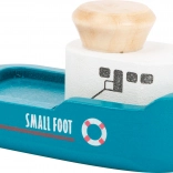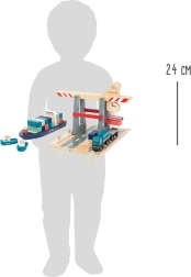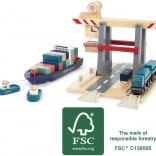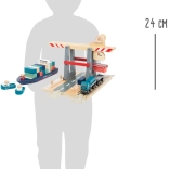 Denne gennemtænkte havnebyggekasse giver børn realistisk logistikleg: Skibet med to slæbebåde er klar til afgang, mens kranen omlader farvede containere ved hjælp af integrerede magneter. Robuste trådele og glidende funktionsdele styrker finmotorik, fantasi og tålmodighed.