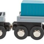 Det blå skib med farvede containere og to slæbebåde forbundet med en snor giver realistisk leg med søtransport.