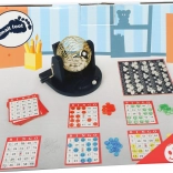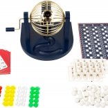 Dette komplette Bingo-sæt indeholder alt til øjeblikkelig leg: metal lodtrækningstromle med håndsving, nummererede kugler, kort og farvede jetoner. Spillerne markerer løbende de udtrukne tal på deres kort, og den der først danner en horisontal, vertikal eller diagonal række af fem, råber “BINGO!”.