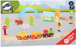 Sættet indeholder 24 dele inklusive magnetisk tog med vogne, klik-sammen træskinner og farverige dekorationer. Det robuste trædesign er behageligt at røre ved, sikkert og ideelt til små hænder. Legen udvikler naturligt finmotorik, øje-hånd-koordination og forståelse for færdselsregler.