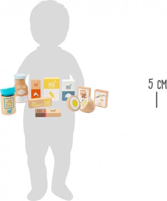 Slip de små bageres fantasi løs med dette 10-deles sæt af træingredienser fra small foot. Indeholder alt, hvad der behøves til bagerolleleg: mel, sukker, fløde, salt, bagepulver, vaniljesukker samt et åb- og samlebart æg. Perfekt til legekøkkenet, støtter rolleleg og finmotorisk udvikling.