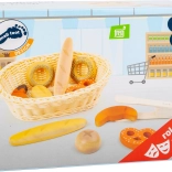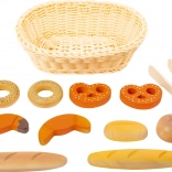 Dette realistiske træ-sæt med bagværk giver børn glæden ved fantasifuld og sikker leg. I den håndværkslignende kurv finder du et udvalg af populære “lækkerier” – fra croissanter og bagels til kringler, horn og donuts. Der medfølger også en trætang, som hjælper børn med at træne greb og koordination.