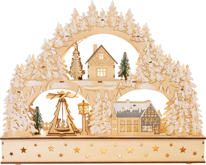 Det håndlavede udtryk, præcise udskæringer af træer og huse samt træets naturlige tone gør buen til et iøjnefaldende midtpunkt i julepynten i vinduet eller på kommoden.