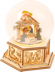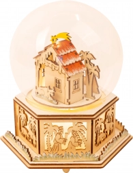 Denne smukke lysdekoration er lavet af kvalitets-træ. Spilledåsen med julemotiv af krybbespillet spiller melodien "Glade jul". Mens musikken spiller, udsender den oplyste festkugle et dæmpet lys. Batterier medfølger ikke. Vigtigste egenskaber: festlig kugle og spilledåse i ét, som giver julen en hyggelig atmosfære; fine, delikate udskårne detaljer; opfylder europæiske sikkerhedsstandarder