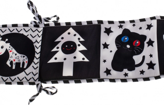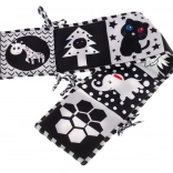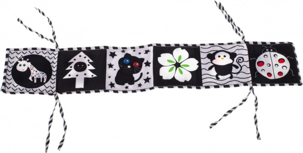Kontrast sensorimotorisk bog, designet som sengeskærm, er det perfekte valg for børn, der begynder at opdage verden. Bogen i harmonikastil kan let fastgøres til sengen med snore, hvilket giver både sjov og sikkerhed.