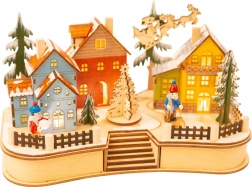 Denne omhyggeligt udførte julelandsby i træ bringer hyggeligt lys og eventyrlig stemning til enhver indretning. Takket være den indirekte bagbelysning træder de detaljerede udskæringer af huse, træer og vinterscener smukt frem. Når lampen tændes, begynder juletræet midt i landsbyen at dreje, hvilket giver en levende og festlig effekt.