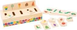 Denne kvalitets trækonstruktion støtter børns naturlige udvikling gennem leg. De farvede træbrikker placeres i de tilsvarende åbninger i låget, så barnet øver sortering efter form og farve, hånd–øje-koordination og tålmodighed. Takket være de kompakte mål er æsken en fantastisk ledsager både hjemme og på farten.