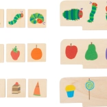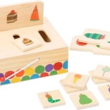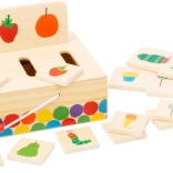 Opdag den smarte træ-sorteringsæske inspireret af historien Very Hungry Caterpillar, som hjælper børn med at genkende former og farver, træne logisk tænkning og finmotorik. Den praktiske æske med låg og 19 dele er ideel også på farten – lukning med elastikbånd og træknap holder alt samlet.