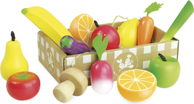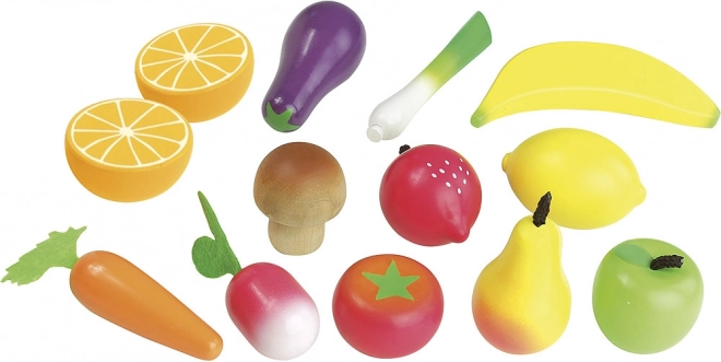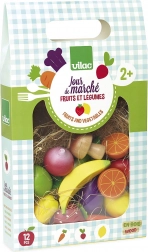 Dette kvalitets-sæt fra VILAC giver børn et farverigt udvalg af populære frugter og grøntsager. Trækonstruktionen med filttilbehør er holdbar, sikker og behagelig at røre ved. Sættet er perfekt til leg i legekøkkenet og på markedet, og det understøtter kommunikation, kreativitet og læring om sund kost.