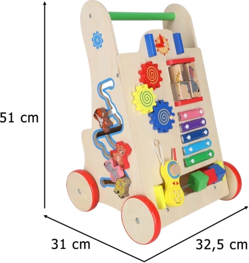 Opdag den multifunktionelle træskubbevogn 6-i-1, som kombinerer støtte ved gang og et læringscenter i ét. Frontpanelet tilbyder mange aktiviteter: bevægelige urvisere, roterende tandhjul, en lille xylofon med kølle, skydbare elementer og drejelige billeder. På siderne finder du formsortering og en sjov labyrint med dyr. Takket være den stabile konstruktion og hjul med skridsikker gummi bliver gangen mere sikker og tryg.