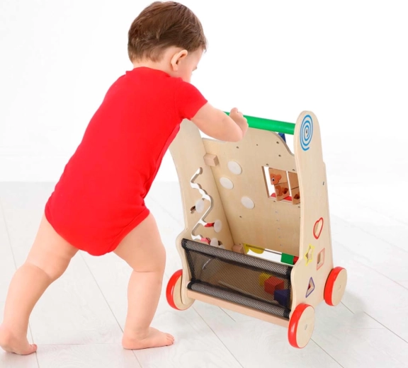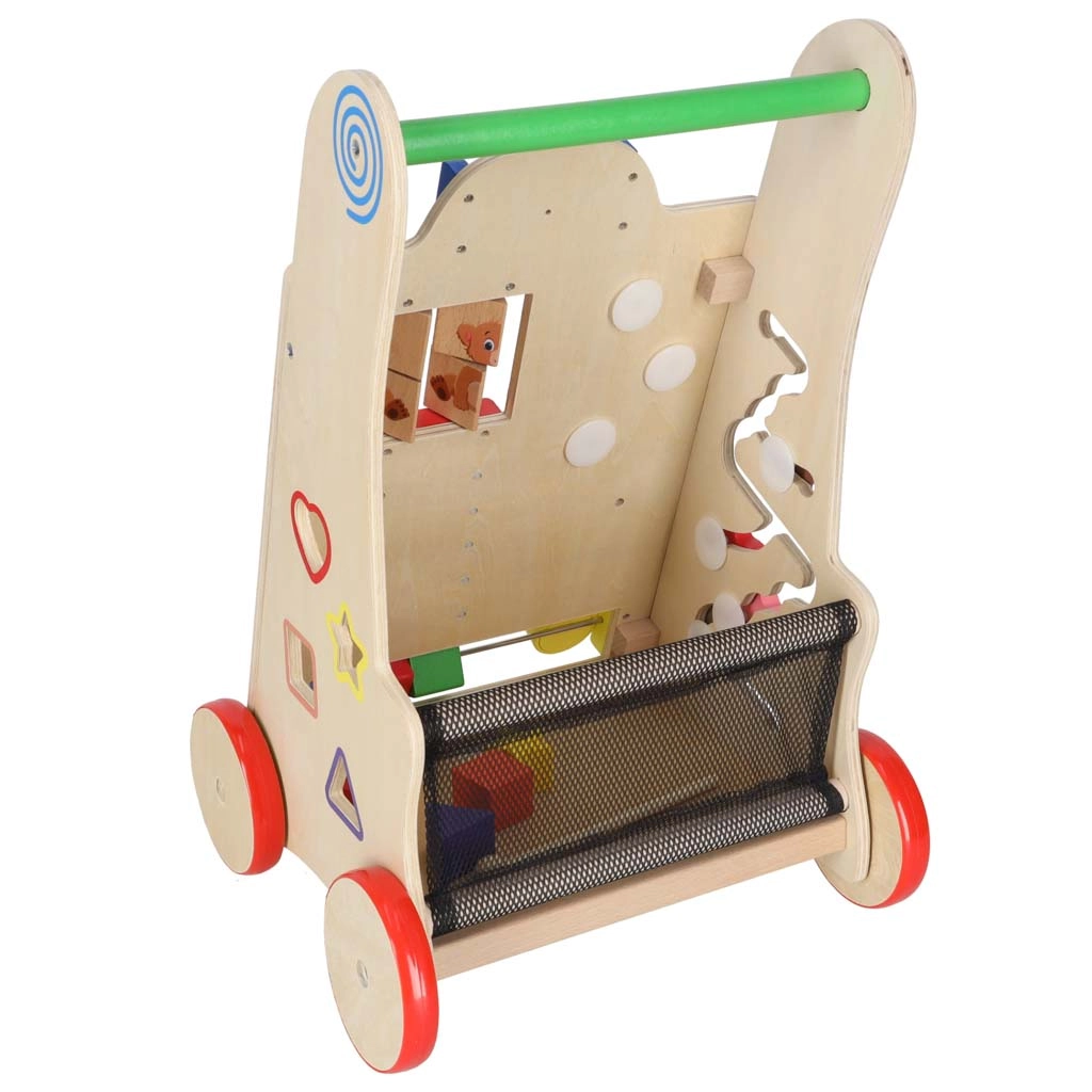 Den robuste trækonstruktion og hjul med skridsikker gummi hjælper barnet med at øve gang med større sikkerhed og balance.
