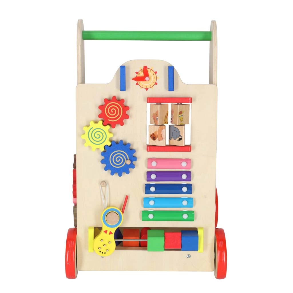 Træskubbevogn 6-i-1 hjælper børn sikkert med at øve deres første skridt og tilbyder samtidig rige aktiviteter for finmotorik, sanseopfattelse og læring. Den stabile konstruktion med gummihjul giver tryghed under gang, mens xylofon, tandhjul, ur og formsortering underholder i timevis. Den praktiske opbevaringskasse med net rummer både kølle og andre legetøj.
