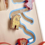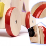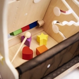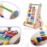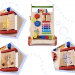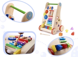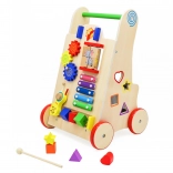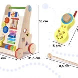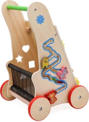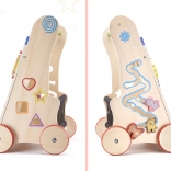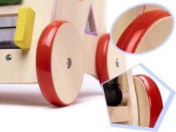 Alle dele af skubbewognen er nøje slebet for at beskytte små hænder mod splinter og malet med ugiftige, miljøvenlige farver. Konstruktionen er stabil, med træhjul belagt med gummi for ekstra sikkerhed. På siderne har skubbewognen også en formsorterer med fire farvede klodser og en labyrint med søde dyr.