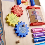 På forsiden findes en plade, der er fuld af interaktive elementer til at stimulere barnets sanser, herunder ur, tandhjul og klokkespil.