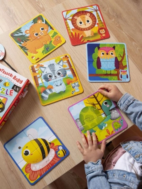 Sættet Montessori Følelsespuslespil indeholder 24 brikker, som kan sammensættes til 6 forskellige dyremotiver. Hvert dyr har en speciel ru overflade, der hjælper børnene med at udvikle følesansen og observationsevnen. Disse puslespil er designet til at involvere alle barnets sanser og understøtte deres naturlige udvikling.