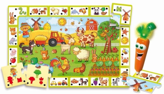 Opdag et sjovt spil for de mindste, hvor børn med en talende gulerodspen lærer at kende husdyr. De samler dobbeltsidede brikker og løser enkle quizzer, som udvikler deres færdigheder. Ideelt til førskolebørn fra 3 år; spillet understøtter logisk tænkning, kendskab til dyr og korrekte svar ved hjælp af den interaktive pen.