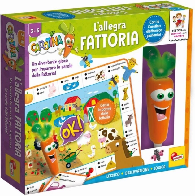 CAROTINA fra LISCIANI bringer sjov og læring med temaet landliv. Børn samler et billede af dobbeltsidede brikker og svarer på enkle quizspørgsmål med den talende gulerodspen. Den interaktive tilgang motiverer til at udforske og lære gennem leg.