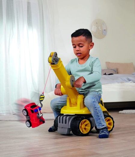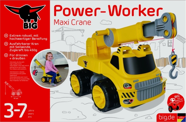 Maxi-kranen BIG Power Worker er en stabil løbecykel af høj kvalitet i robust plast, designet til lang holdbarhed og sikker leg. Kranens tårn drejer 360°, og den bevægelige bom er let at betjene, så børn kan løfte og flytte genstande ved hjælp af det kraftige kabelspil med en trækkraft på op til 450 g.