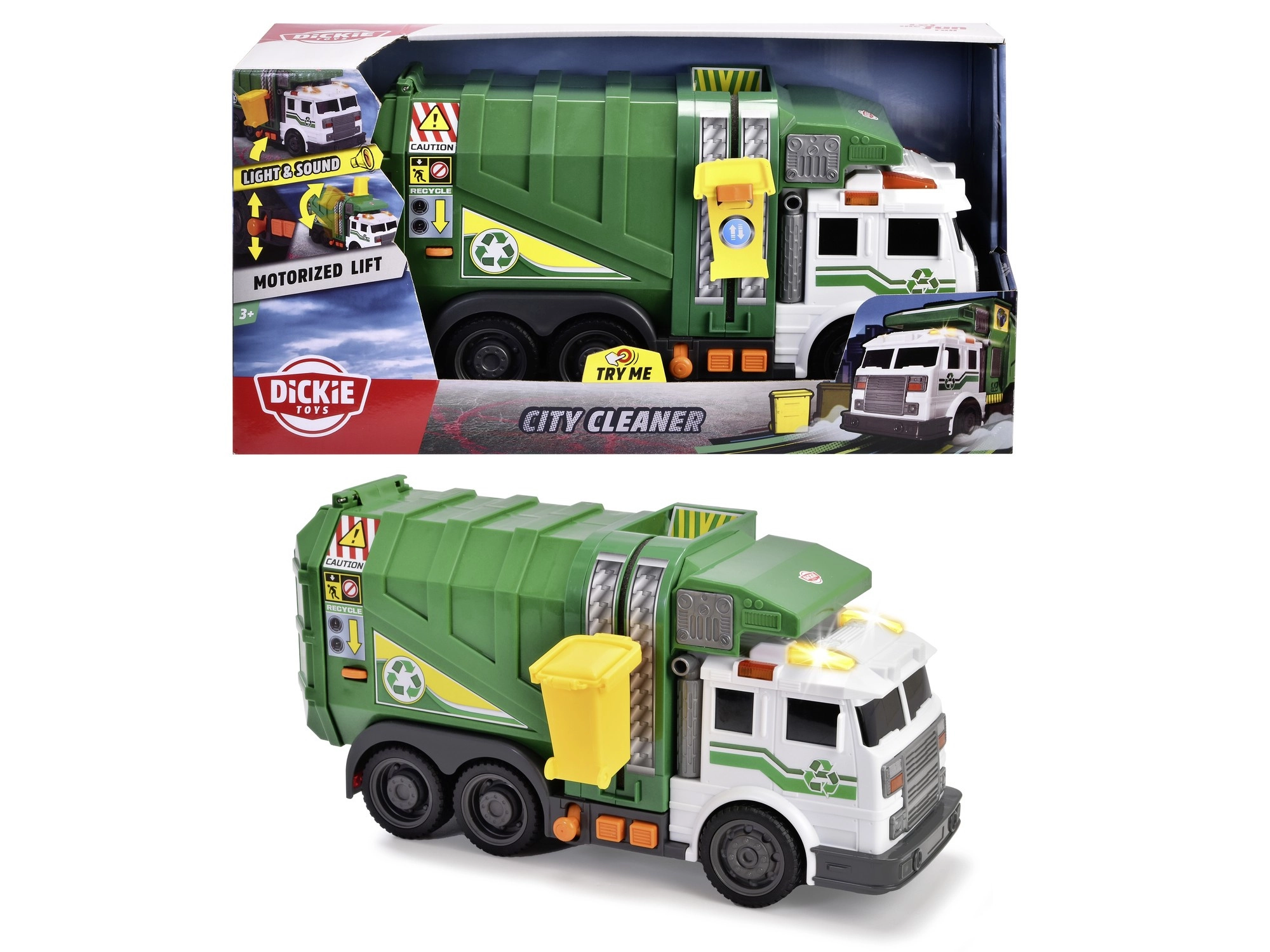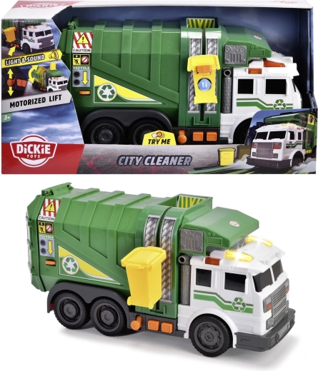 Den realistiske grønne skraldebil City Cleaner fra Dickie Toys begejstrer børn med lys og lyde, en funktionel lift til den gule skraldespand og bevægelige dele. En fantastisk legetøj til leg med affaldsindsamling, læring om genbrug og udvikling af finmotorik.