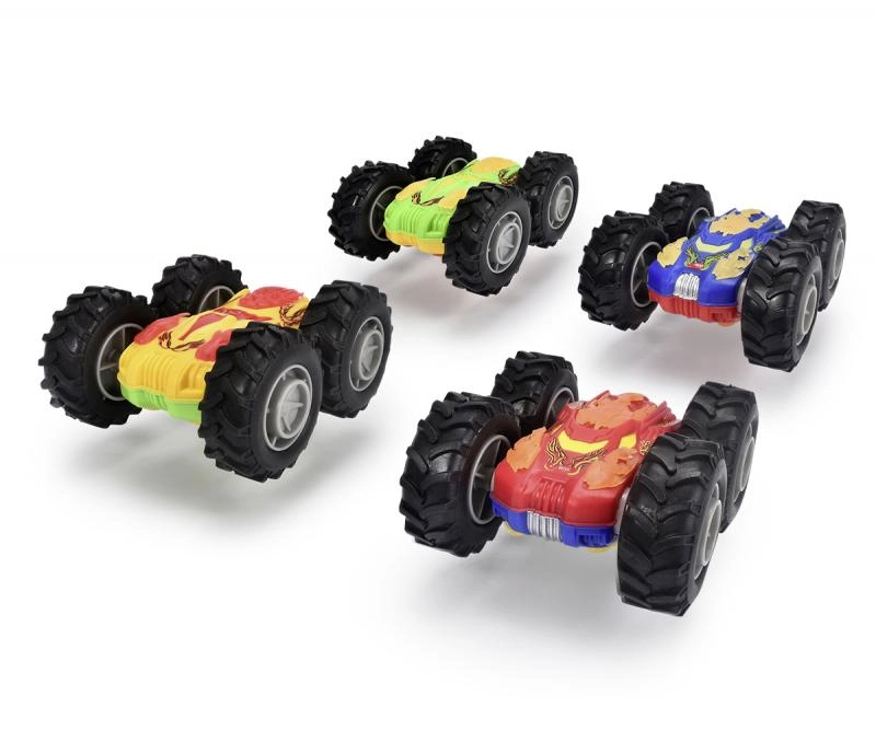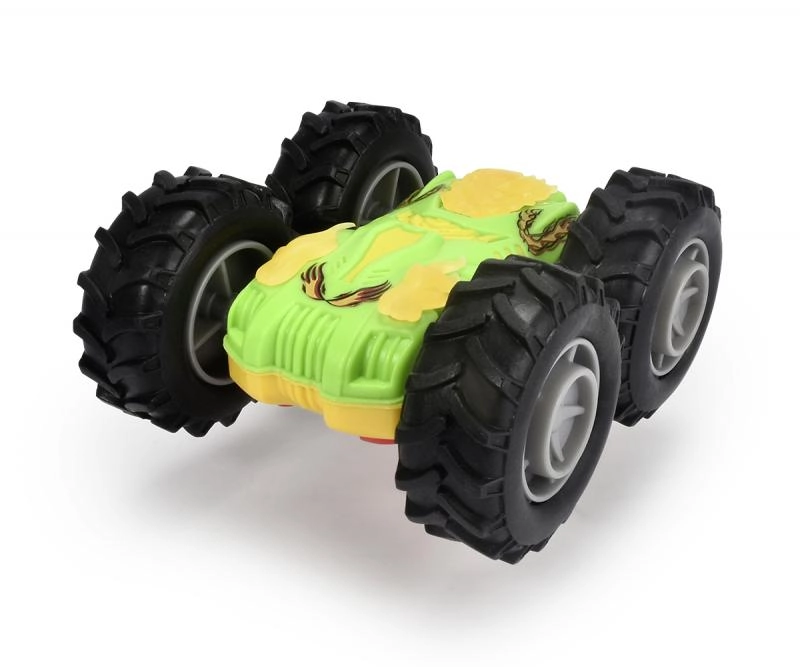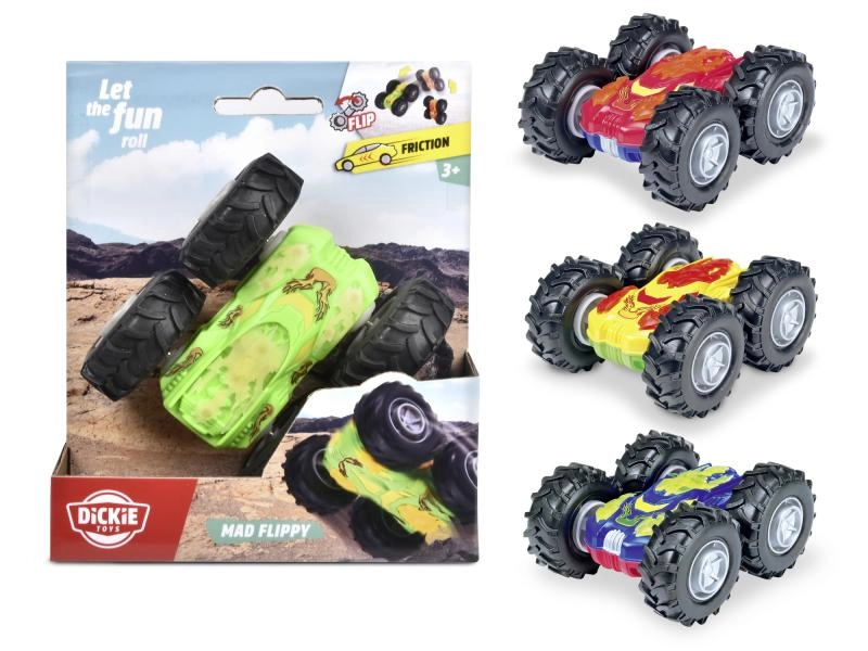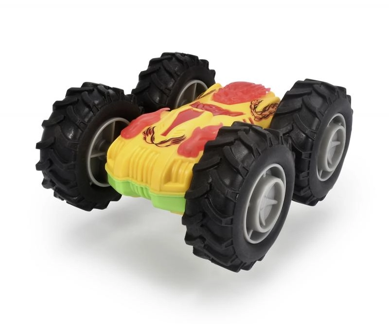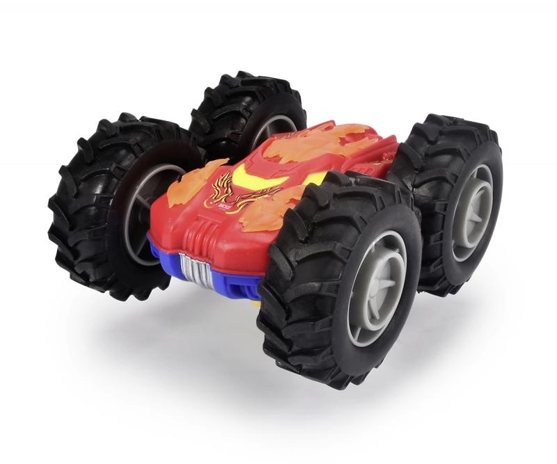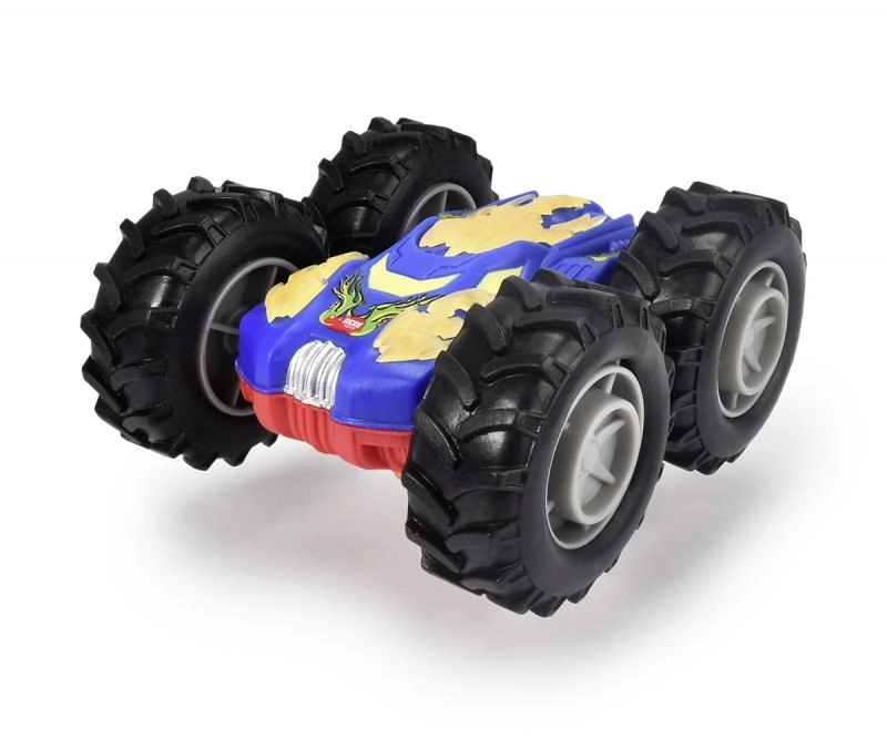Friktionsbil med store hjul og flip-funktion. Længde ca. 10 cm.